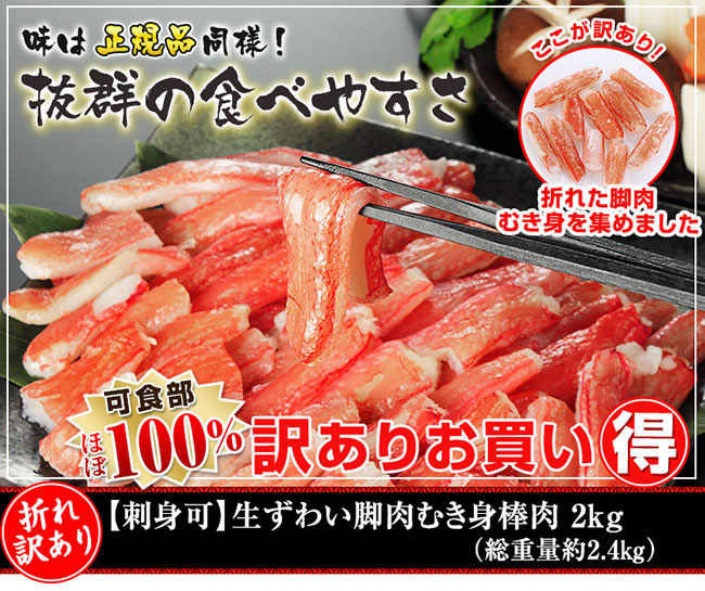 生ズワイの加工の時にできた脚折れや肩外れ、不揃いな形だけを集めた訳ありだから、形以外は正規品の生ズワイと全く同じ鮮度と美味しさ!